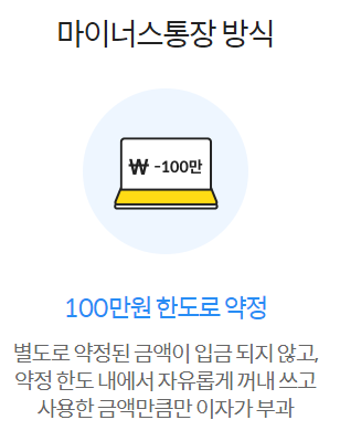 마이너스통장방식은 대출기간 동안 한도 내에서 언제든 상환 및 재사용이 가능해 필요할 땐 쓰고 필요하지 않으면 갚아두어 이자비용을 아낄 수 있는 장점이 있는 상환방법입니다.