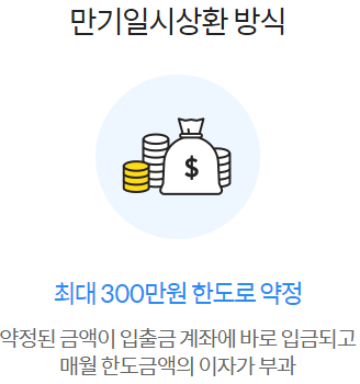 단 만기일시상환으로 빌릴 땐 최대 300만원 한도까지 가능하며, 마이너스 통장일 경우 100만원까지 가능합니다.