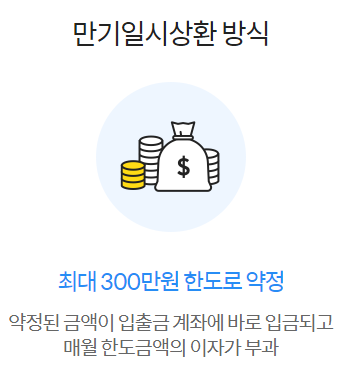 만기일시상환 방식 선택 시 300만원까지 가능하며 ,마이너스통장 방식일 경우 100만원까지만 가능합니다.