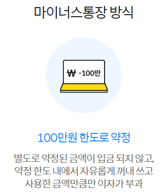 마이너스통장방식이란 대출기간 동안 한도 내에서 언제든 상환 및 재사용이 가능해 필요할 땐 쓰고 필요하지 않으면 갚아두어 잘 사용하면 이자비용을 아낄 수 있습니다.