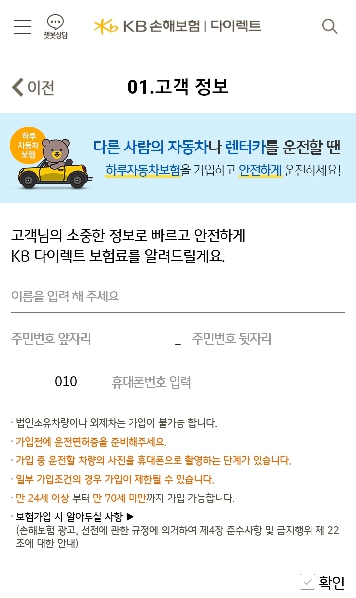 KB손해보험 원데이 자동차보험 정보