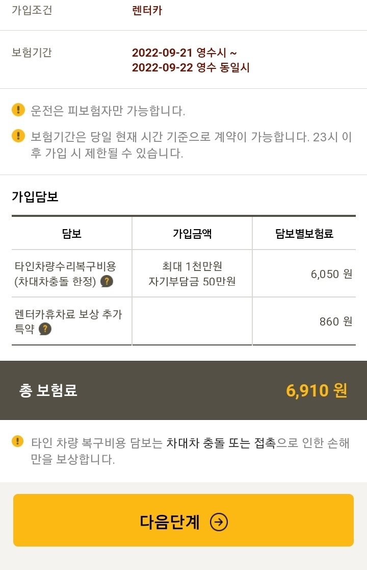 입력을 다 하고나면 보험료가 계산되어 산출되고 결제를 하면 보험가입이 완료됩니다.