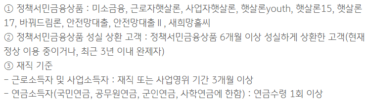 그래서 만일 자격 조건에 해당 되지 않는다면 글 하단에 서민금융진흥원의 햇살론유스 및 햇살론15 , 새희망홀씨대출 상품 등 정보를 글 하단에 둘테니 참고 하시길 바랍니다.