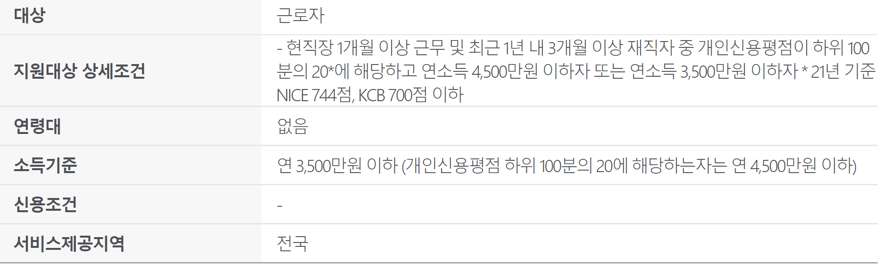 연소득 3천5백만원 이하이거나 연소득 4천 5백만원 이하이면서 개인신용평점이 하위 20% 이하인자는 가능합니다.