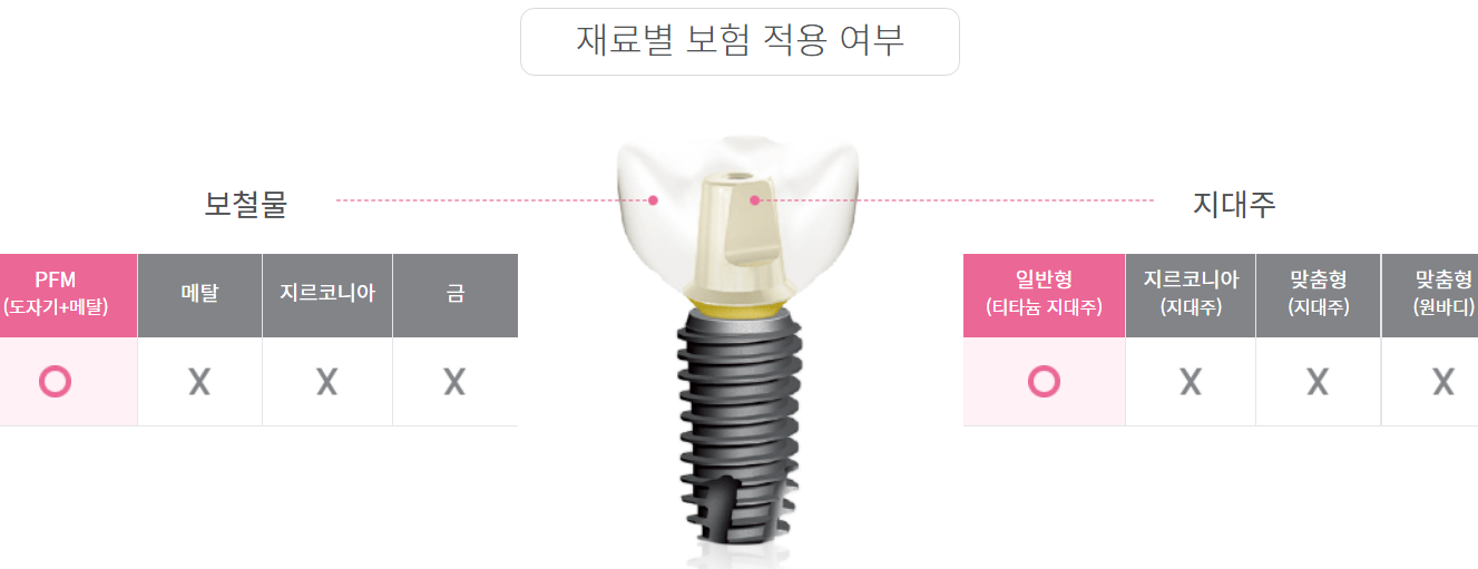 A. 안됩니다. 보철재료를 금 ,메탈,지르코니,PFG 등으로 치과임플란트를 시술하는 경우엔 보험 적용이 불가합니다.