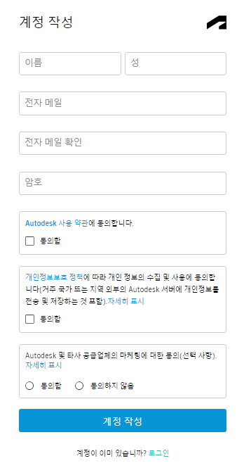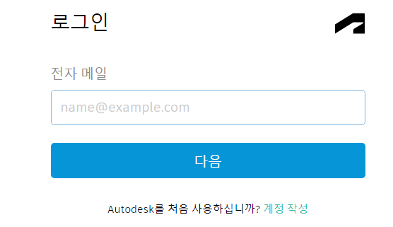 그다음 로그인을 해야 하는데 만일 기존에 사용하는 오토데스크 계정이 있는 경우 그냥 사용하셔도 되지만 없다면 계정 작성을 클릭합니다.