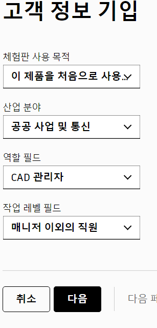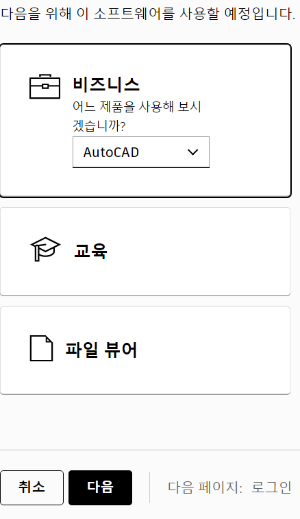 비즈니스에서 선택을 클릭 후 Auto CAD를 선택하신 뒤 다음을 클릭하세요.