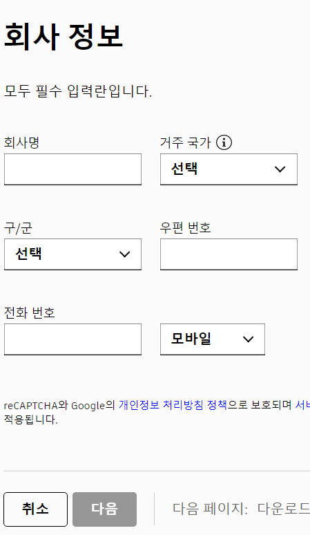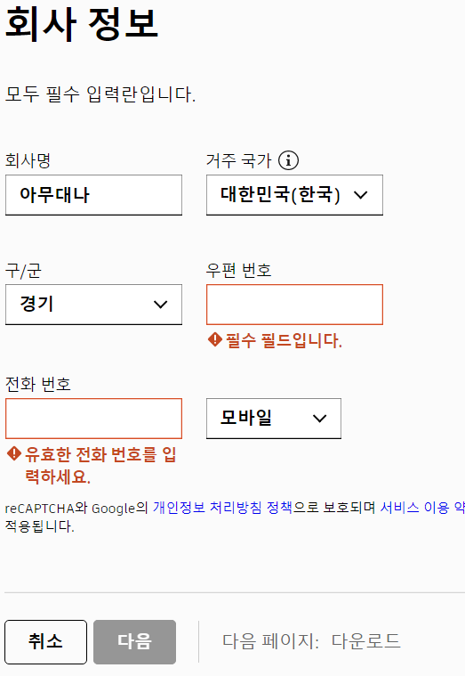 회사명이나 이런 곳에 걱정하실 필요는 없습니다. 저처럼 아무거나 적으시고 다음 누르시면 됩니다.