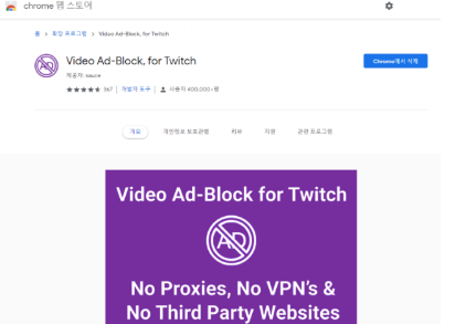 크롬 웹스토어 검색창에 Video Ad-Block for Twitch를 검색하셔서 설치를 진행해주시면 됩니다.
