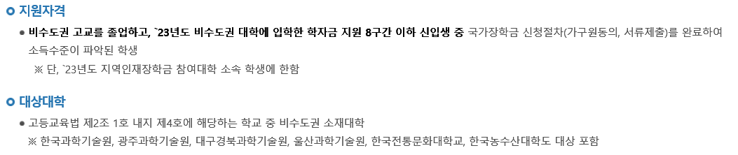 지역인재 장학금은 지역대학의 우수 인재 유치 및 미래인재 양성을 위해 지원되는 장학금으로 지원 자격 및 지원대상 대학은 다음과 같습니다.