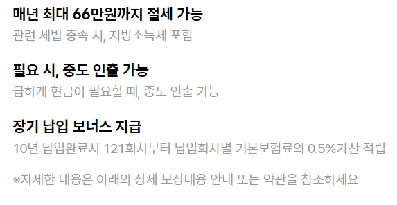 이 상품을 가입하면 매년 최대 66만원까지 절세가 가능하며, 급하게 현금 필요 시 중도인출도 가능합니다.