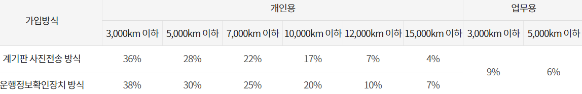 에코 마일리지 특약은 연간 3천km ~ 15,000km 이하로 주행 시 특약할인을 해주며 거리에 따라 할인율이 아래와 같이 달라집니다.