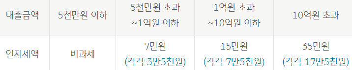 인지세란 인지세법에 의해 대출 약정을 체결할 때 납부하는 세금이며 세액에 따라 차등 적용되며 인지세는 은행과 고객이 각각50%씩 부담합니다.