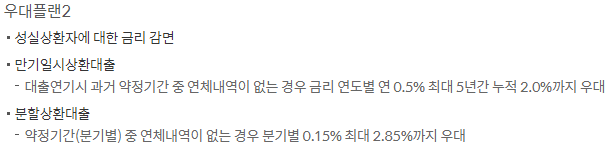 우대금리 조건은 우대플랜 1,2로 나누어져 있으며 아래와 같습니다.