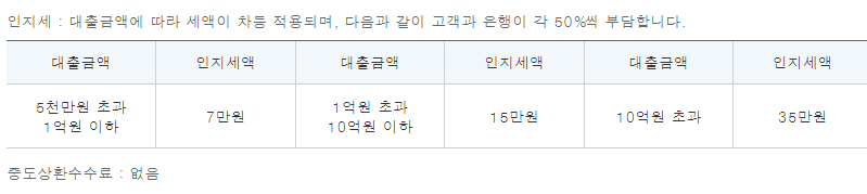 인지세란 인지세법에 의거하여 대출 거래 약정 체결 시 내는 세금으로 5천만원 이하까지는 비과세이며 초과 시 대출금액에 따라 세액이 결정되며, 이 인지세는 은행과 고객이 각각 50%씩 부담합니다.