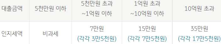 인지세란 대출거래 신규 약정 시 내는 세금으로 대출 금액에 따라 아래와 같이 인지세액이 차등 적용되며 이 인지세는 은행과 고객이 각각 50%씩 부담하게 됩니다.