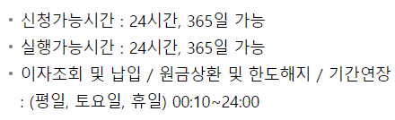 대출기간은 만기일시 상환 및 마이너스통장 방식의 한도대출은 1년 이내 약정을 하며 최장 5년까지 만기 연장이 가능합니다.