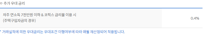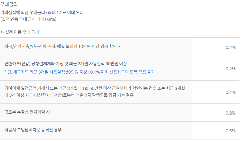최종 적용금리는 기준금리 + 가산금리 - 우대금리를 적용하며 우대금리 조건은 아래와 같습니다.