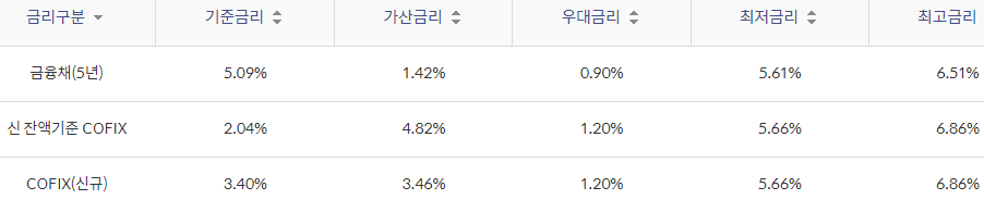 대출금리는 금리구분에 따라 아래와 같이 달라집니다.
