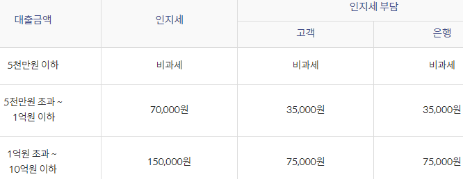 인지세란 대출 거래 신규 약정 시 내는 세금으로 대출 금액에 따라 아래와 같이 차등 적용되고 발생한 인지세는 고객과 은행이 각각 50%씩 부담하게 됩니다.