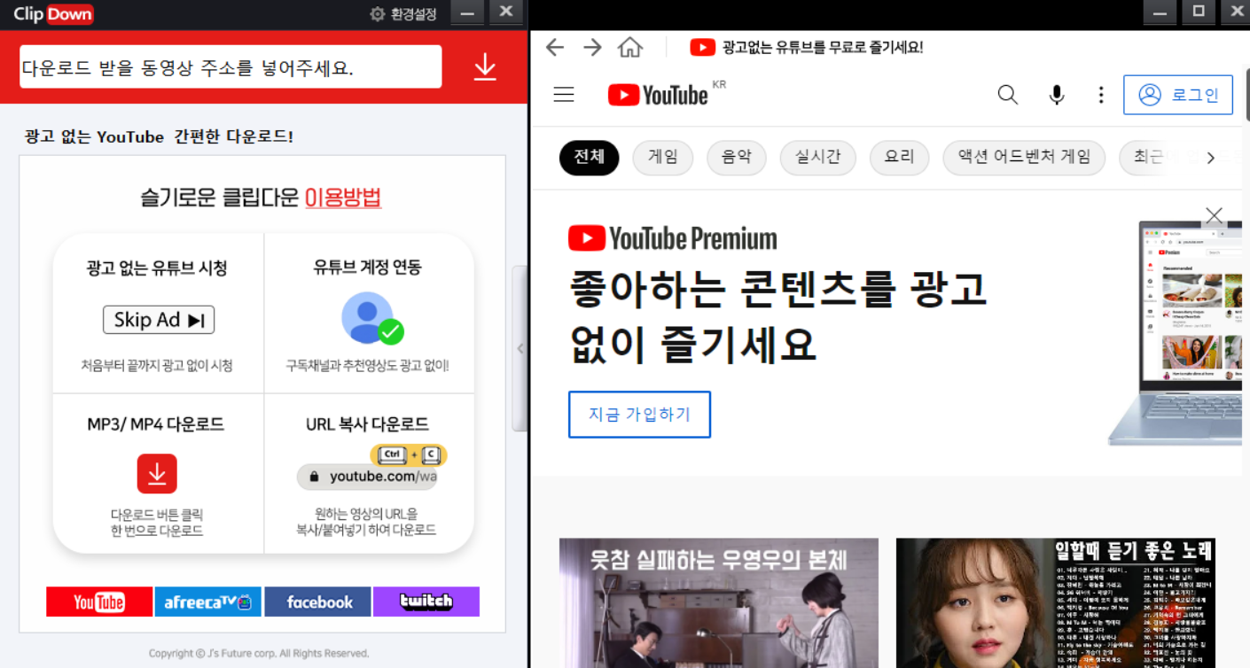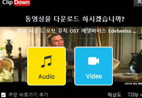 클립다운입니다. 클립 다운은 유튜브의 노래를 다운로드하여 광고 없이 동영상 시청을 할 수 있으며, mp3파일이나 실제 영상을 인코딩하여 라이브 공연도 볼 수 있습니다. 우선 비디오 파일, mp3파일 두 가지 방법으로 다운로드할 수 있어 정말 좋습니다.