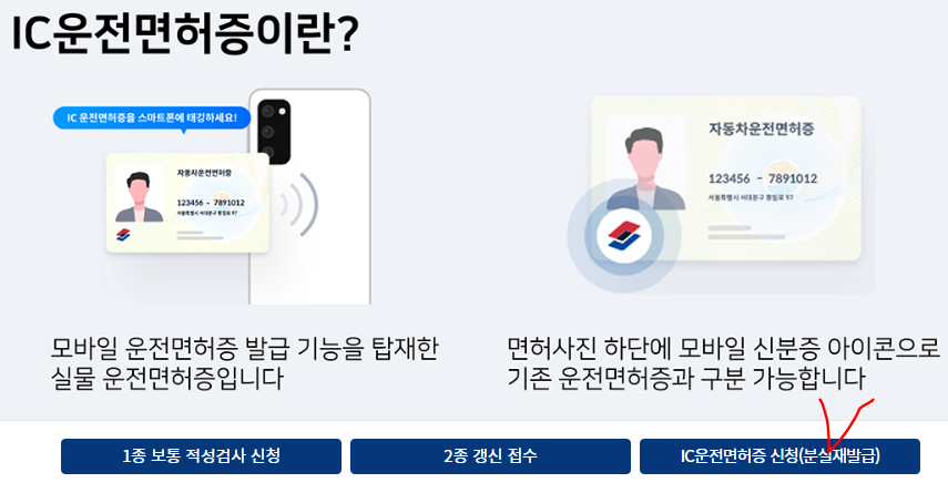 클릭하고 나면 다음과 같은 사진이 뜨고 'IC운전면허증 신청(분실 재발급)을 클릭하세요