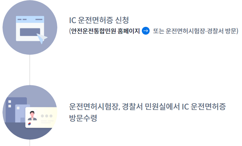 이렇게 방문 신청 혹은 인터넷 신청을 통해 IC 운전면허증을 발급 받으셨다면 아래 사진 절차와 같이 진행 하시면 됩니다.