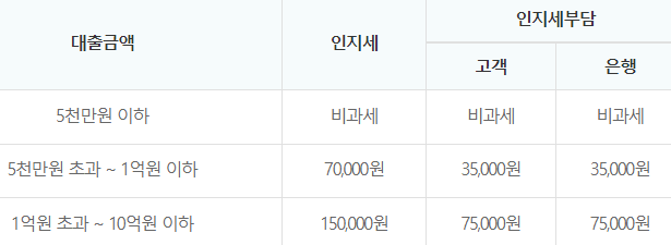 인지세란 인지세법에 따라 대출계약 약정 시 내는 세금으로 5천만원 이하인 경우에는 비과세이며, 비용은 고객과 은행이 각각 50%씩 부담합니다.
