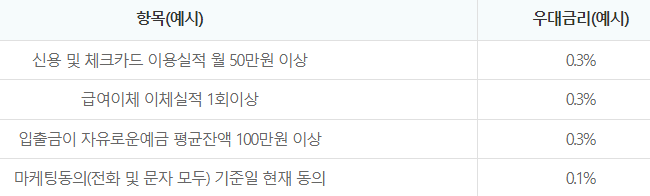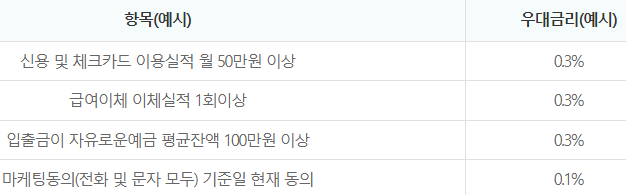 우대금리 조건은 최대 1%이내이며 아래와 같습니다.