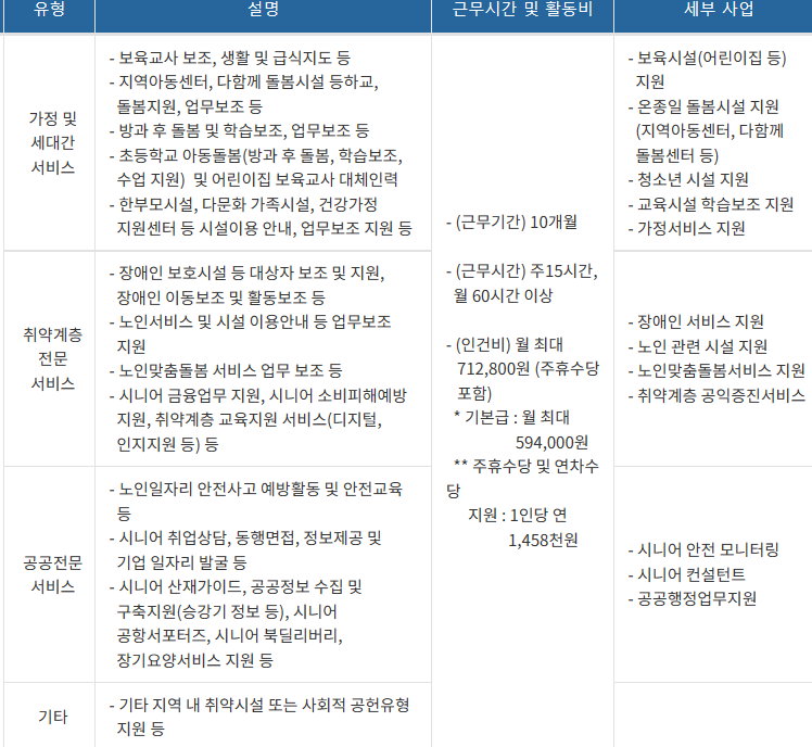 사회서비스형은 노인의 경력 및 활동 역량을 활용하여 사회적 도움이 필요한 영역(지역 사회 돌봄 ,안전 관련 등)에 서비스를 제공하는 일자리로 월 60시간 ,월 59.4만원(주휴수당 별도)을 지급합니다.