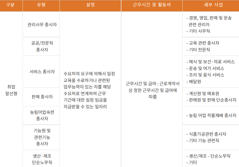 취업알선형은 구인자(수요처)의 요구에 따라 일정 교육을 수료하거나 관련 업무 능력이 있는 분들을 해당 수요처로 인계하여 근무기간에 대한 일정 임금을 지급 받을 수 있습니다.