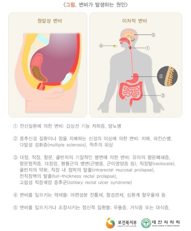 변비의 원인은 크게 다른 질환에 의해 이차적으로 증상이 발생한 경우와 명확한 원인 없이 대장, 직장의 운동기능 장애로 인해 발생하는 원발성 또는 기능성 변비로 나눌 수 있습니다.