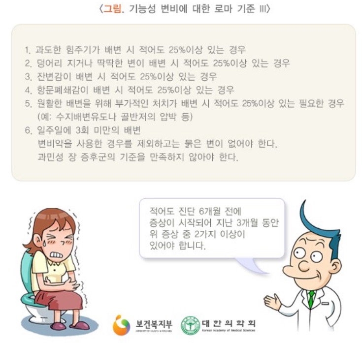 변비 환자들이 호소하는 증상은 매우 다양하여 단지 배변 횟수만으로 변비를 진단하기 어려운 경우가 많습니다. 따라서 이를 해결하기 위해 여러 학자들이 주기적으로 모여 6가지 대표적인 증상으로 변비의 객관적인 기준을 정하고 있는데 이를 로마기준이라 부릅니다.