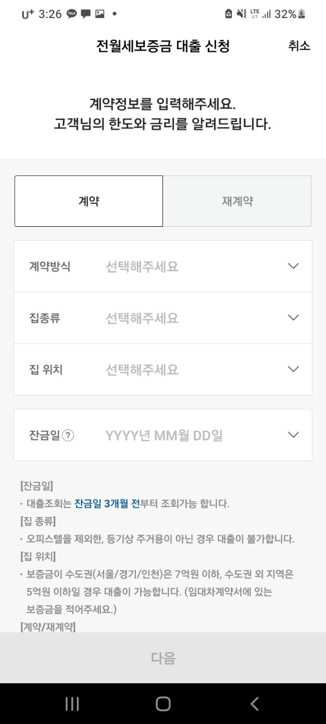 자신이 계약하는 주택의 정보를 입력, 계약방식, 주택 종류, 수도권 여부, 보증금 등을 입력 하고 다음