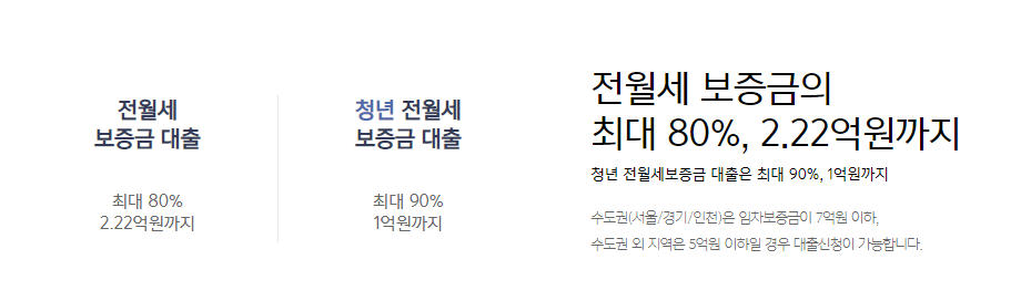 2. 일반 전월세 보증금 대출은 주택 보증금의 최대 80%까지 가능하며, 한도는 2.22억 원 까지 가능합니다.
