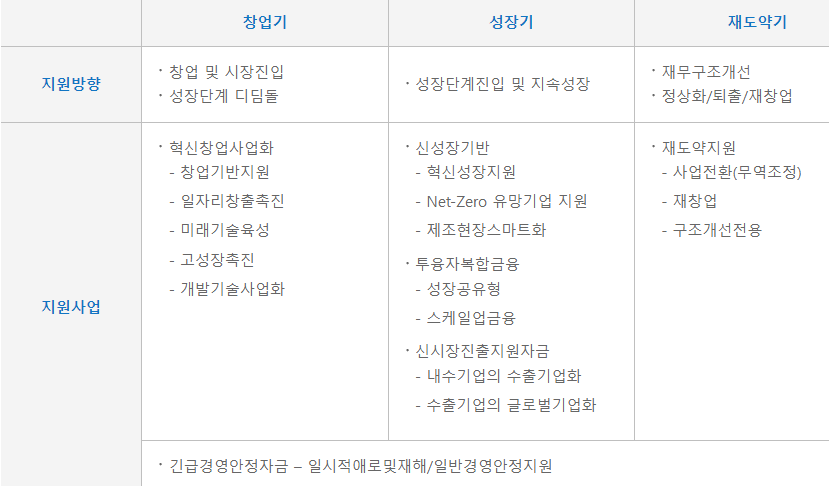 5조 600억 가량의 사업으로 기업 성장 단계별로 나누어 특성과 정책 목적에 따라 세부 자금으로 나누어 운영합니다.