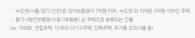 수도권의 경우 임차보증금이 7억원 이하인 곳, 수도권 외 지역은 5억원 이하일 경우 대출 신청이 가능합니다.